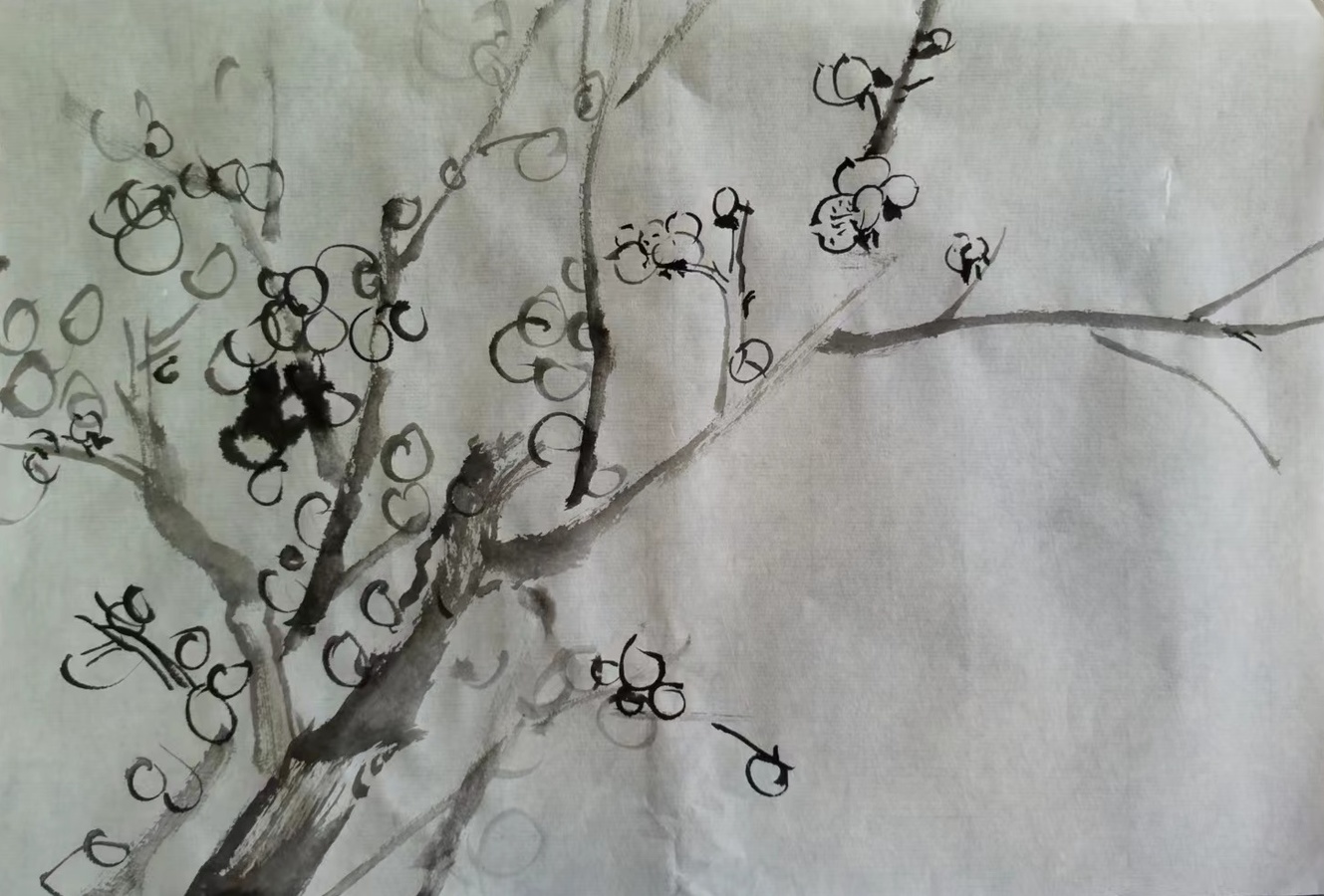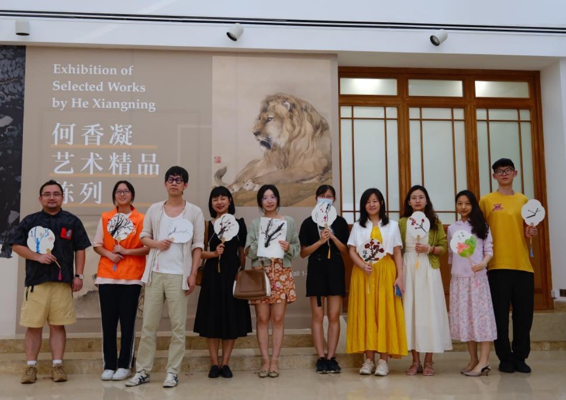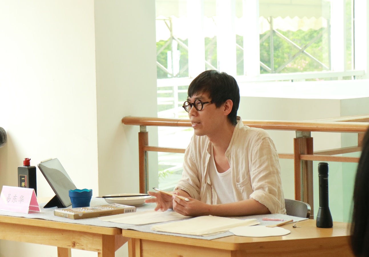 随后,大家参加了梅花扇艺术创作工作坊。易博士从着墨用笔到构图修稿讲解了梅花创作的要点,并逐一进行示范。随着毛笔在纸上游动,干湿浓淡的墨色变化、生动古拙的线条、独具姿态的枝干……一一映入大家的眼帘,生动展示了中国传统绘画的艺术之美,也激发了师生的创作热情。