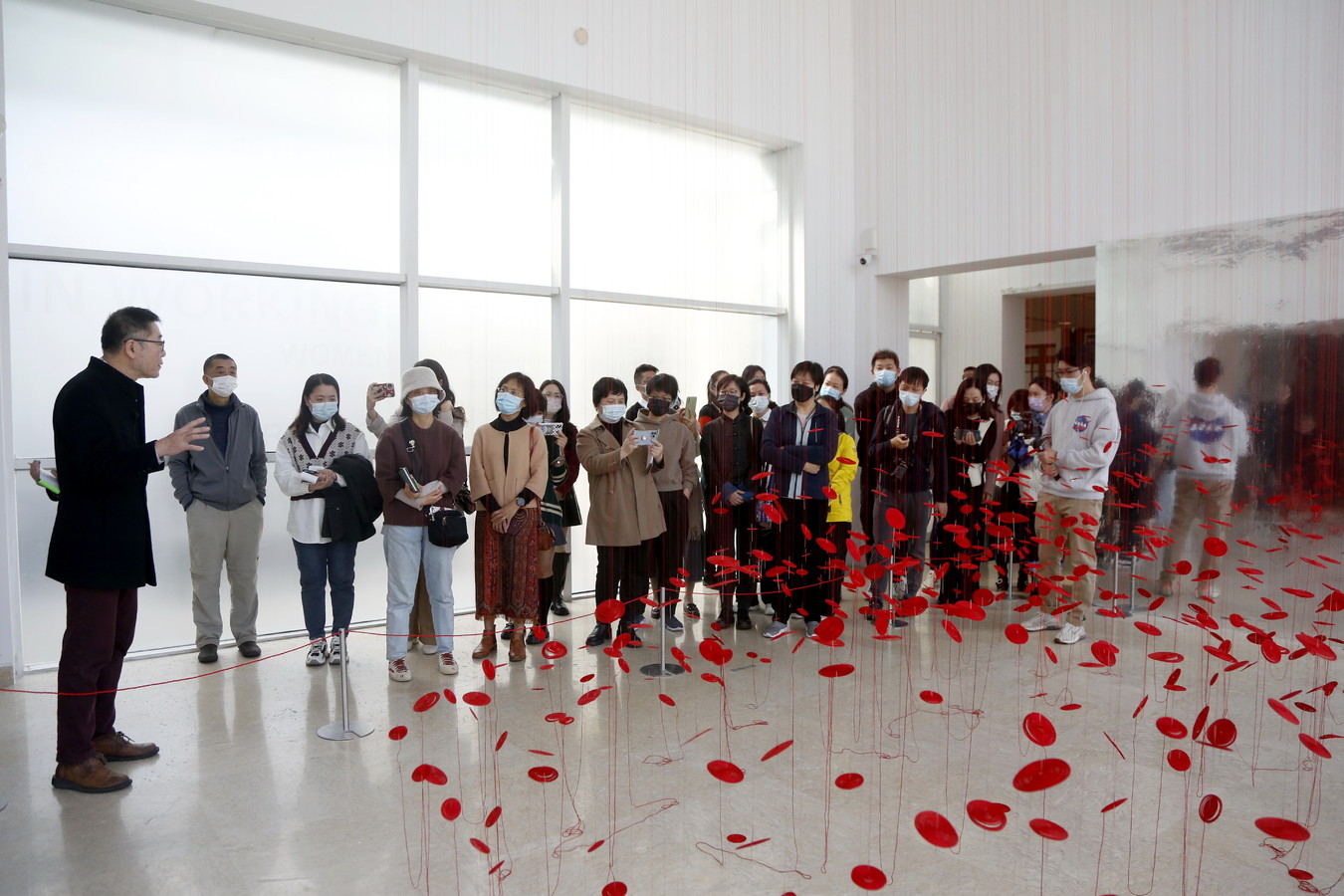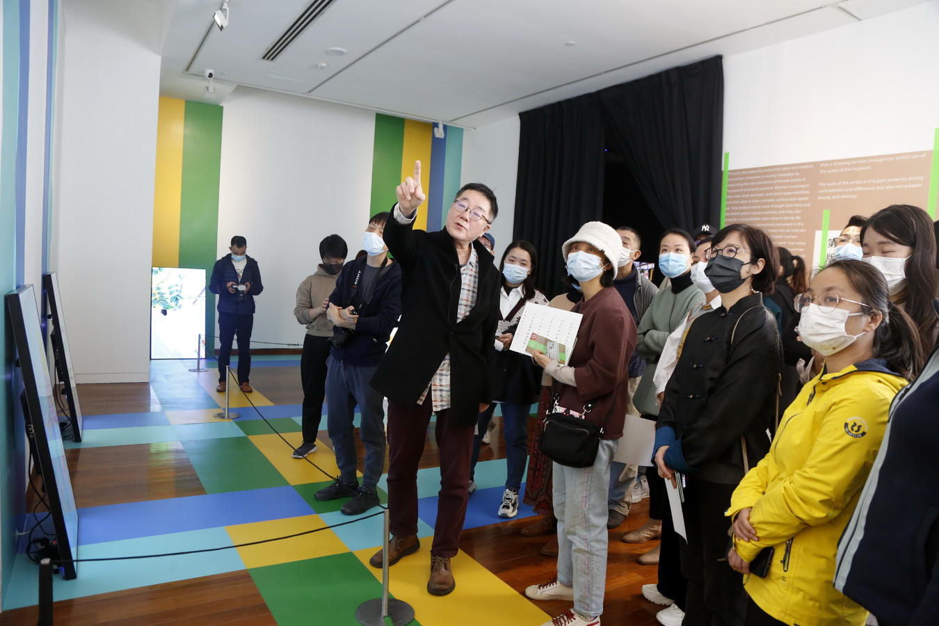 王璜生教授首先说明了本次展览的特殊性。他提到本次展览的参展艺术家均为女性,她们以女性的视角为出发点,对女性在社会、家庭等环境中担任的角色进行思考并转化成艺术实践,但她们的视角又不仅仅局限于此,其范围之广既包括移民的历史问题也有对跨越语言的可能性的探索。在导览尾声,观众、媒体向王璜生教授提出了他们的个人见解,并围绕着展览本身进行了讨论和问答。导览活动结束后,王璜生教授接受了雅昌艺术、深圳广电集团记者的专访,深入地谈及了自己对作品、艺术家、及其创作背景的见解。王璜生教授还接受了何香凝美术馆的邀请展开访谈交流,并录制了纪录片。导览视频、专访视频、展览宣传片在美术馆微信公众号、官网、B站、抖音等媒体平台播出。